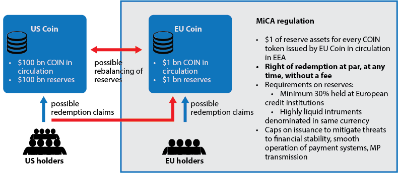 Notes: The diagram conceptualises the flow of reserves and redemption claims between an EU and a US stablecoin issuer. It highlights how tokens can move and be redeemed in either jurisdiction, while underlying reserves remain subject to two regulatory and supervisory silos, increasing the risk of misalignment in crises.