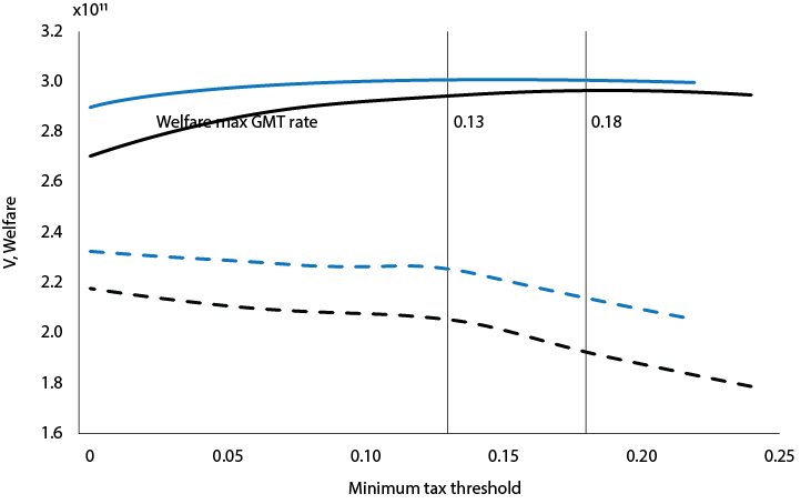 Based on our simple measure of welfare as a tax revenue-investment trade-off, for a country with a 30% home corporate tax rate (the black lines), the optimal GMT rate is 18%, while this rate is 13% for a country with a 20% home corporate tax rate (the blue lines).