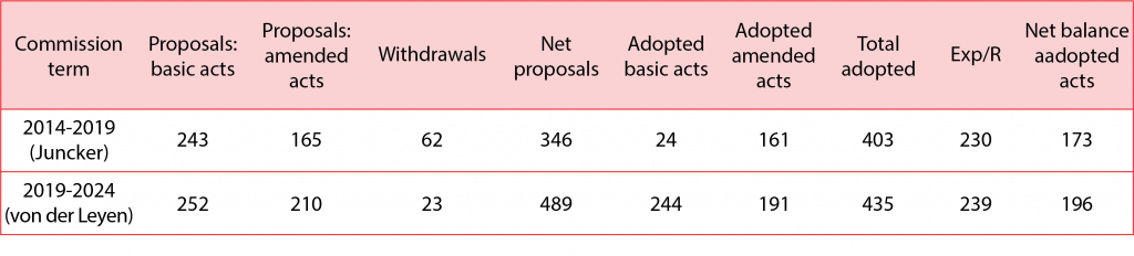 Table 1 shows two measures of the net flow of legislation: 1) the number of Commission proposals less withdrawals, and 2) the number of adopted acts less repeals. Withdrawals and repeals are not keeping pace with new proposals and adopted acts, with the result that the net volume of legislation continues to increase.