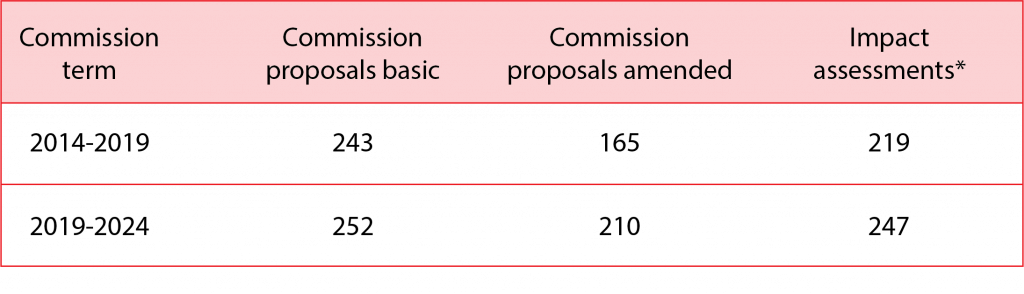 The number of EU laws has steadily increased. There are different ways to calculate the growing volume of legislation (total number of acts, total number of pages or words; Marcus, 2024; Herby, 2024). All metrics point to an increasing number of Commission proposals in each term and continued high rates of adoption of new laws. Under President Ursula von der Leyen, the Commission has opted for regulatory budgeting to control the flow, but the ever-increasing numbers of proposals shows that this has had no effect.