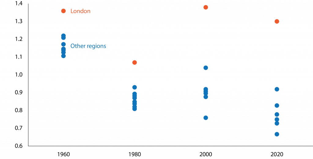 Figure 1. UK regional GDP per worker relative to European mean, 1960-2010