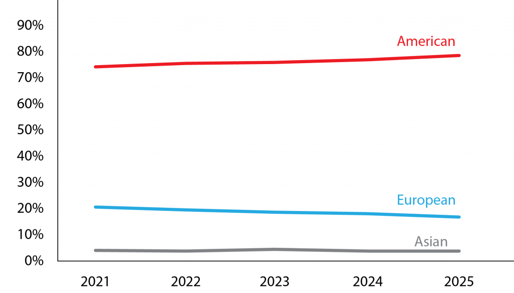 We have also calculated market shares for global asset management. Figure 3 shows the global share of North American (US and Canadian) asset managers increased from 73 percent in 2021 to 78 percent in 20253, while the share of European (EU, UK and Swiss) players decreased from 21 to 17 percent over the same period. The share of Asian asset managers is stable at 5 percent. This confirms the general picture of the rise of primarily US asset managers and the decline of their European counterparts.