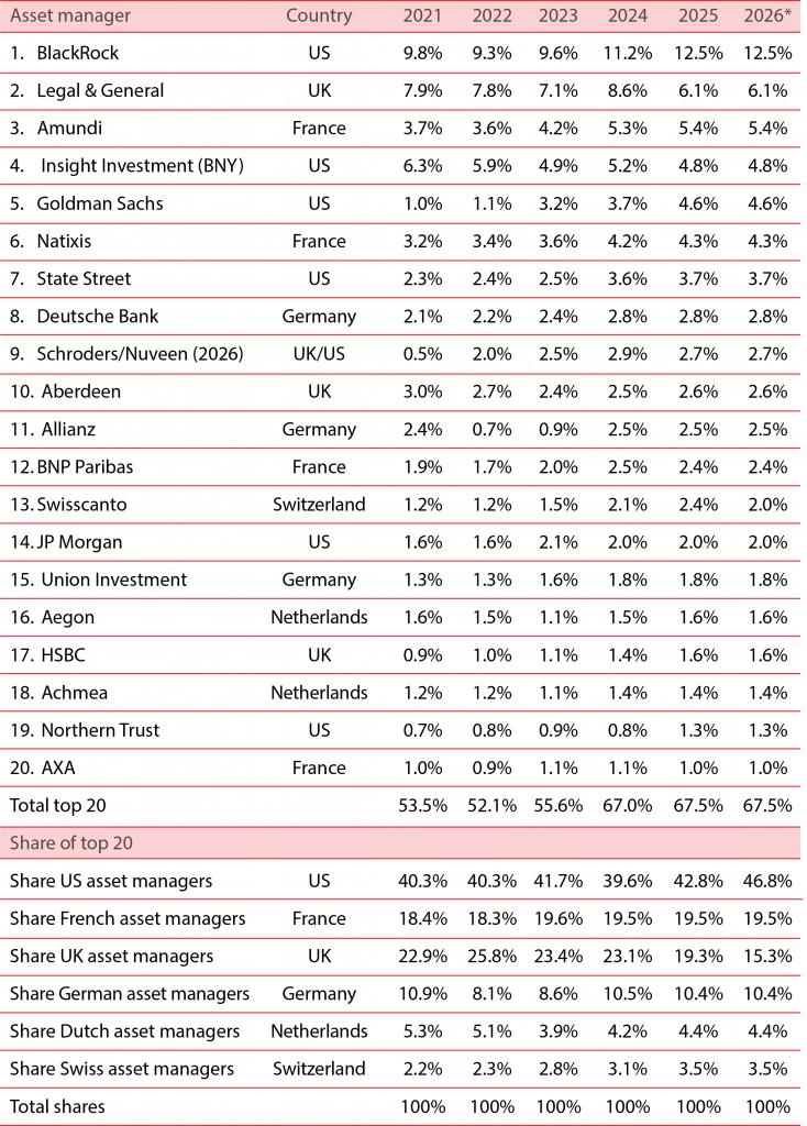 Note: * shares for 2026 are estimated, including the takeover of Schroders by Nuveen.